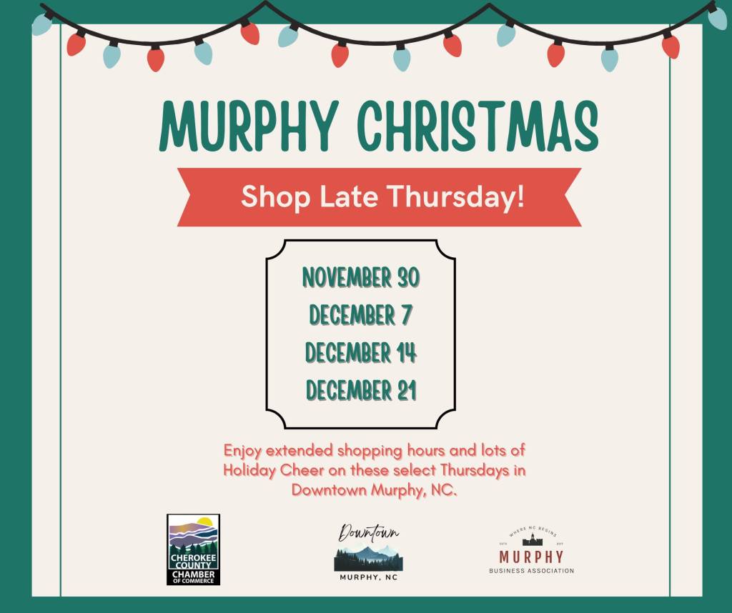 So, now that you’ll be in town Thursday, you can find those perfect gifts at our amazing downtown businesses for Shop Late AND celebrate with the community as we Light the Town of Murphy Christmas Tree at 6:00 pm, this Thursday November 30th!