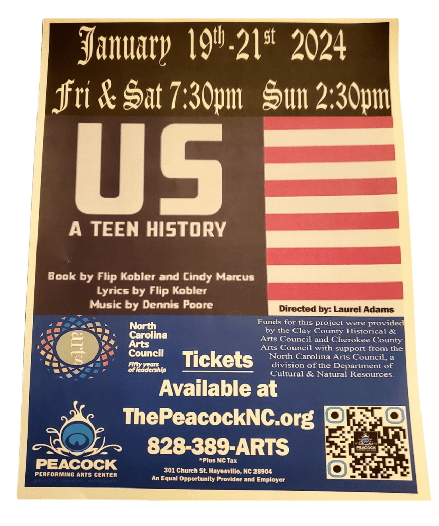 This weekend, the Cherokee County Arts Council has partnered to present US: A Teen History at the Peacock Performing Arts Center. It’s “a walk through American history, from Plymouth Rock to the internet, all told through the eyes of teenagers.”