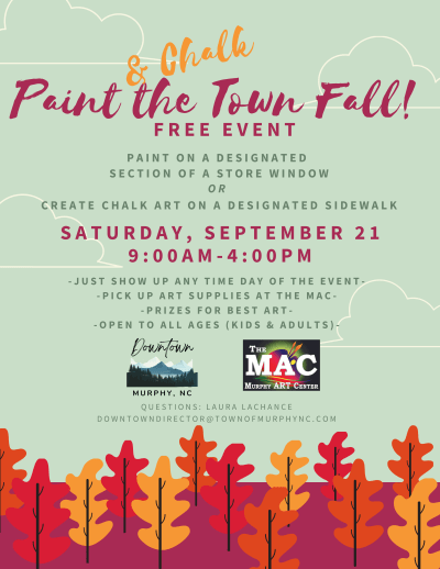 This Saturday is Paint & Chalk the Town Fall in Downtown Murphy, next Saturday is the Cherokee County Arts Council’s Fain Alley Concert, and the following weekend is the John C. Campbell Folk School Fall Festival. We live in a beautiful community!