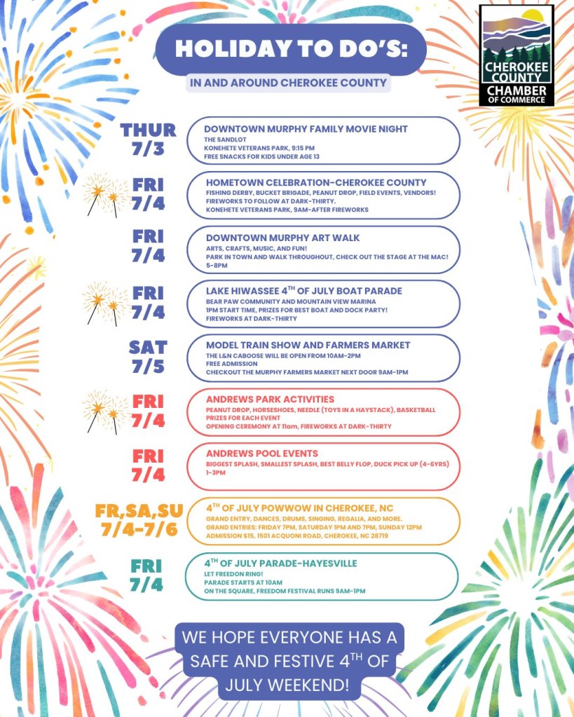 Hosted by the Cherokee County Recreation Department and Town of Murphy, this family-focused celebration runs 9 am–10 pm on Friday, July 4, 2025 Highlights include: