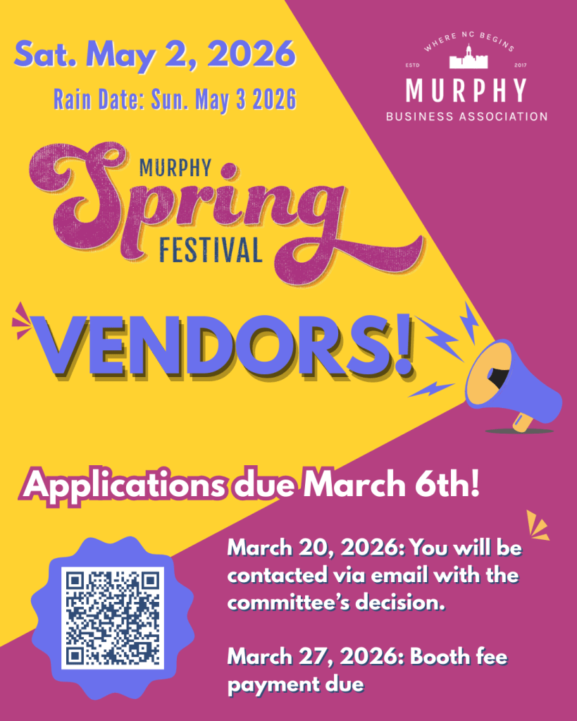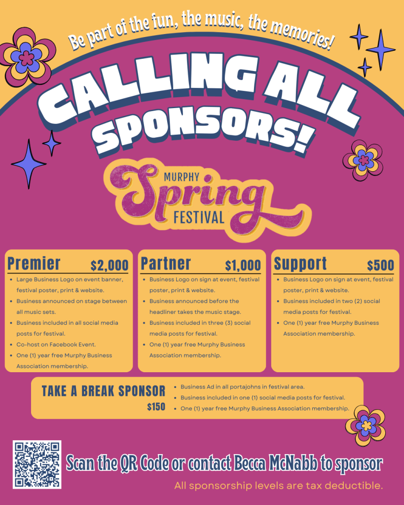 Speaking of warm weather, we’re already dreaming of the first sunny weekend in May for the Murphy Spring Festival. Remember to add the event to your calendar and sign up to Sponsor, Volunteer, or be a Vendor! (Click each image below for more info)